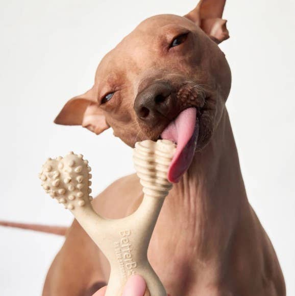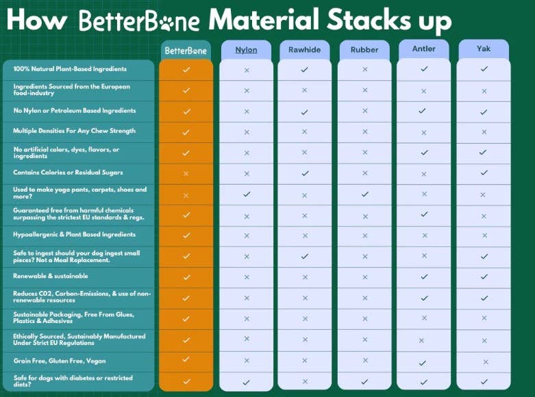 BetterBone Soft Density is perfect for light chewers, teething puppies, and elder dogs, who have a softer chew strength. Made from two natural ingredients, our bones are healthier, safer, and delicious. The best part is, that there is NO NYLON in any BetterBone. This is our small size which is recommended for smaller breeds (15-45lbs). The Classic flavor is hypoallergenic and really great for dogs with sensitive stomachs and has no added flavors. Flaking is to be expected, BetterBone's are splinter resistant. Our material flakes to better protect teeth and could be a little messy but this is to protect teeth! Pair this with our natural, non-toxic, hypoallergenic, and splinter-resistant composition, BetterBone SOFT is the perfect chew toy for your teething puppy, or older dog and light to moderate chewers—the perfect replacement for nylon or rawhide. SOFT will not last as long as nylon but will be safer on teeth. Not a meal replacement.