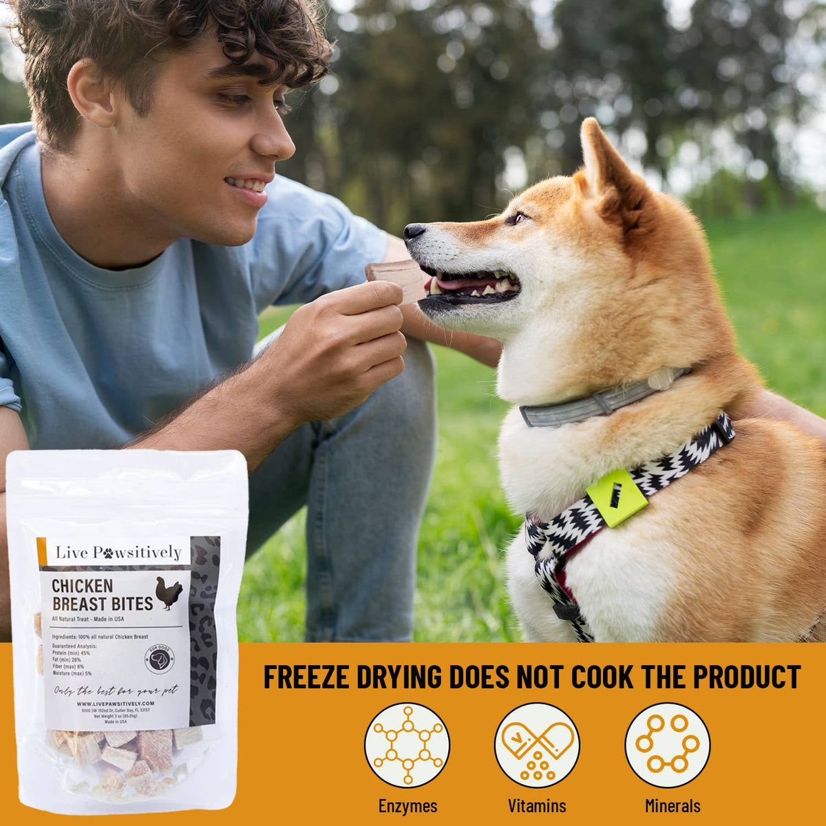 Chicken Breast Bites are a single ingredient dog treat made with 100% of the highest quality human grade, USDA Chicken Breast inspected and free of additives, grains, gulten and hormones. Freeze drying is a unique process that keeps all the vitamins, minerals and enzymes that were original to the product prior to the freeze drying process. Freeze Drying does not cook the product, it simply extracts moisture; It is still considered a raw diet product without the mess and storage issues. Freeze dried products have a long shelf life and never requre refrigeration.