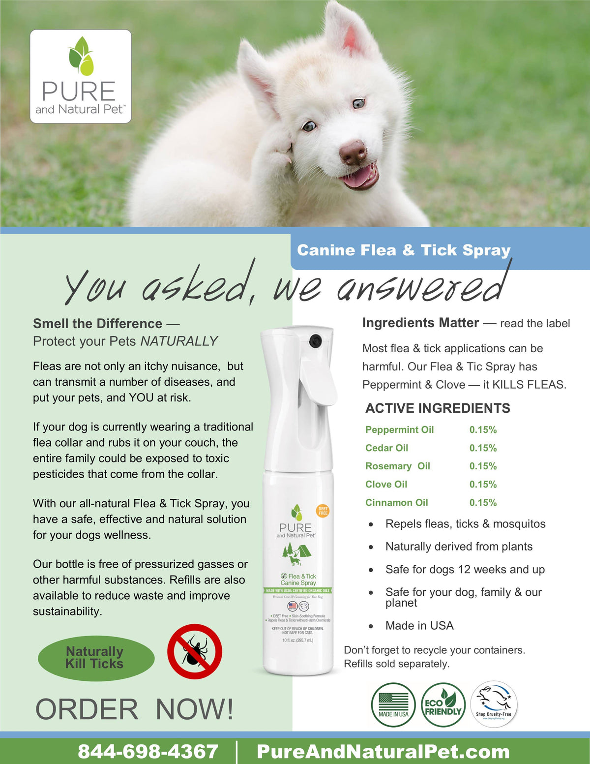 Safe and effective with no harsh chemicals, our Flea & Tick Spray combats fleas and ticks on contact. The Lavender, Cedar, and Peppermint repels fleas, ticks, and mosquitoes to prevent infestation. Pyrethrin and permethrin-free. The spray can be used directly on dog.