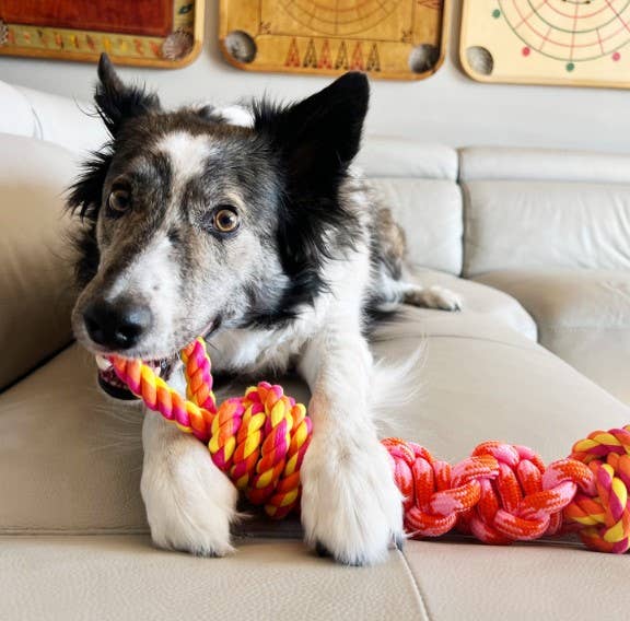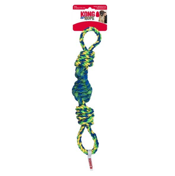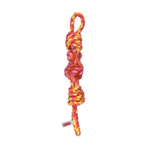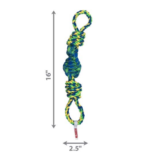 KONG Rope Bunji’s internal elastic bungee cord adds dynamic spring for extra-fun tugging and tossing with this durable, knotted, twisted rope toy. Two easy-grab loops deliver interactive ease while the bungee softens the tugging motion. Ideal for indoor and outdoor action.