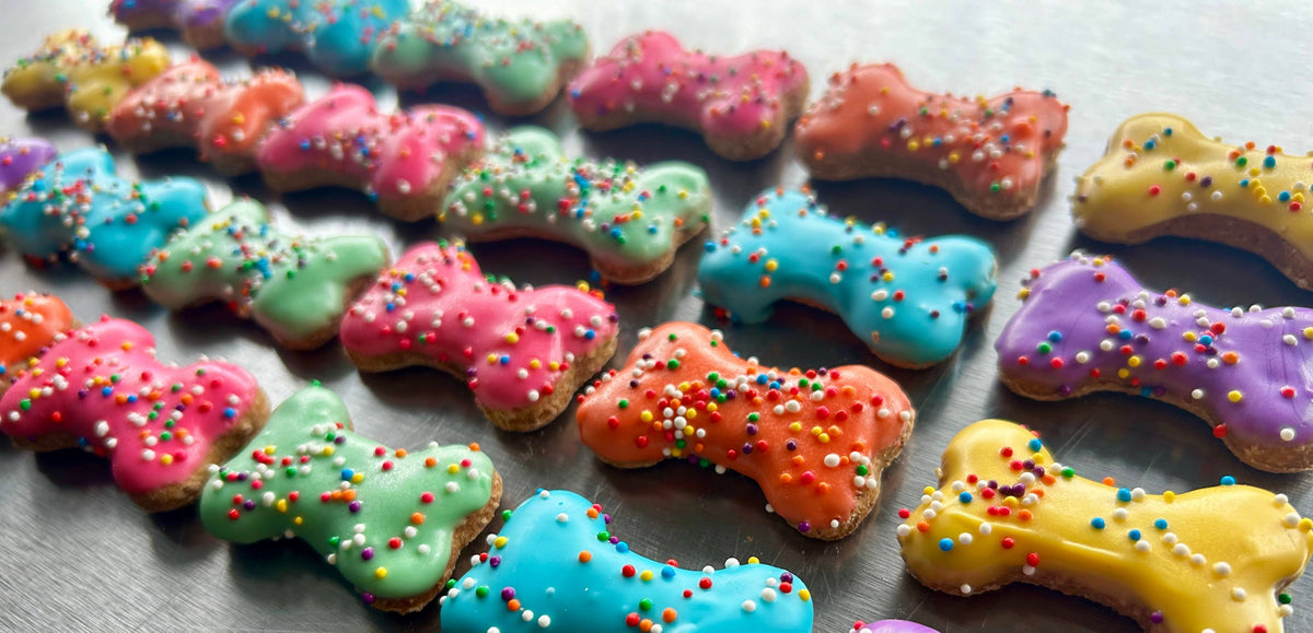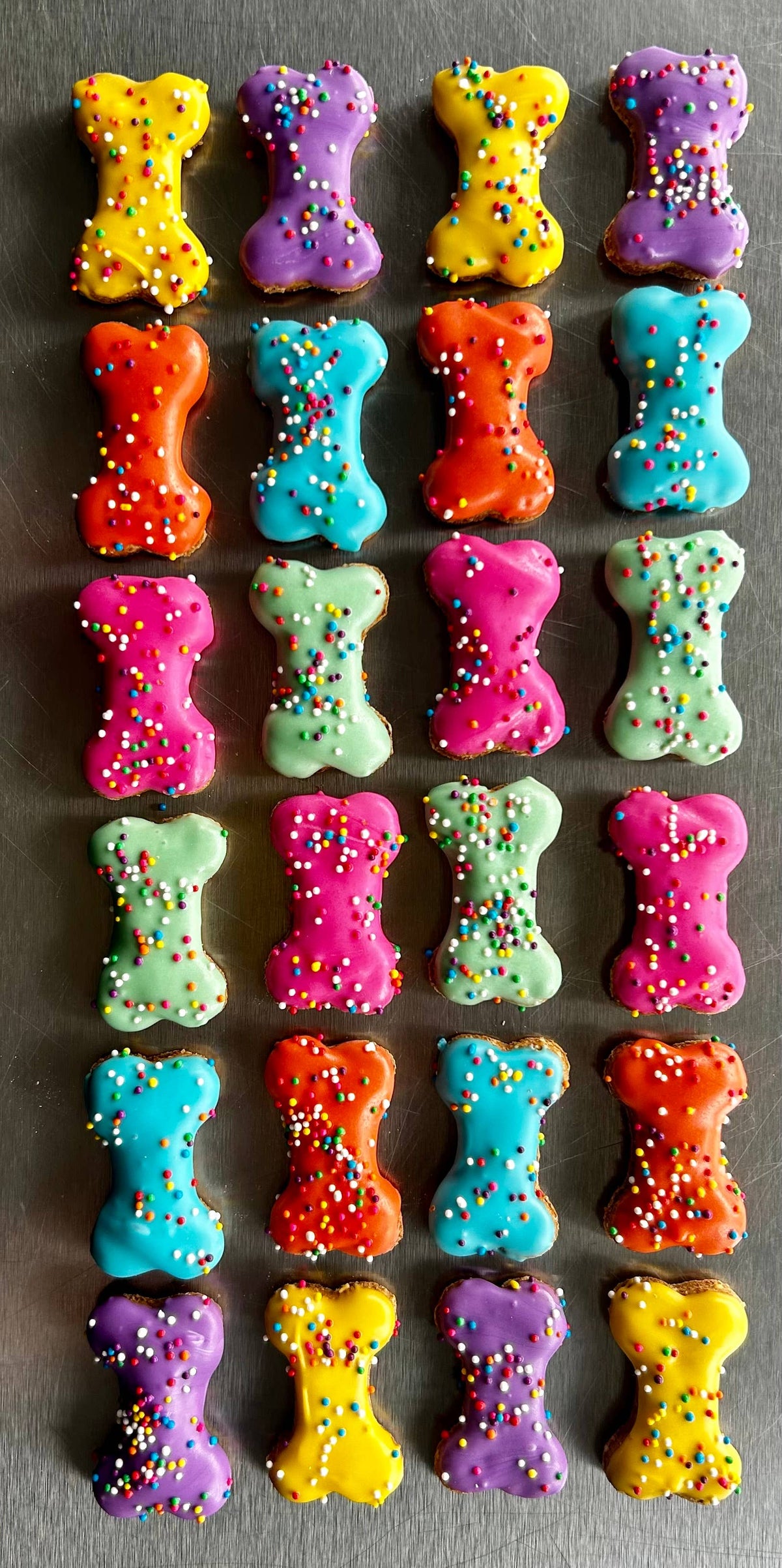2 inch dog bone in yogurt chip icing & sprinkled with confetti ends, these hand designed treats are a best seller!