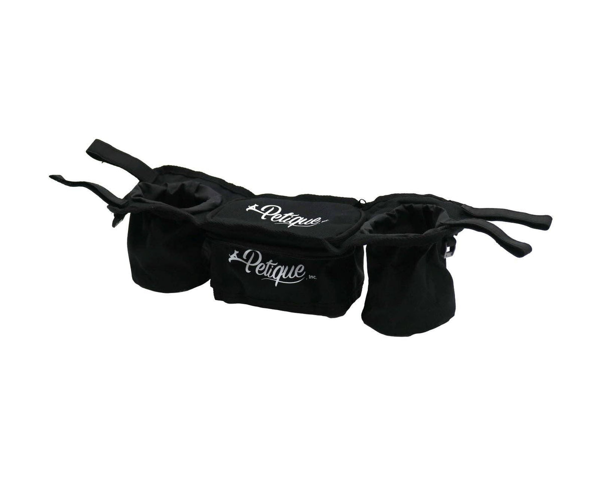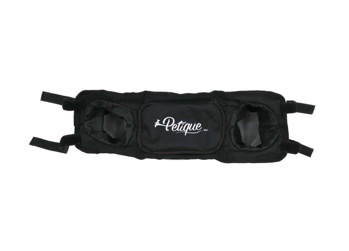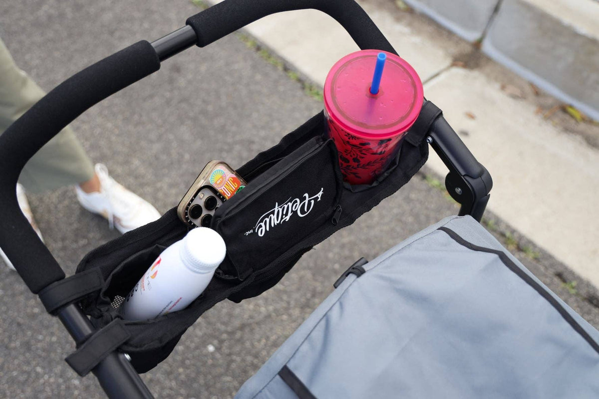 Petique’s Portable Stroller Organizer is a must have accessory that comes with two cup holders and a secure storage pocket to keep your items hands-free and within reach! The portable organizer is designed with heavy-duty material and adjustable Velcro that holds beverages, phones, treats, keys, and more! When the Portable Stroller Organizer is not in use, you can fold it back into a convenient pouch.