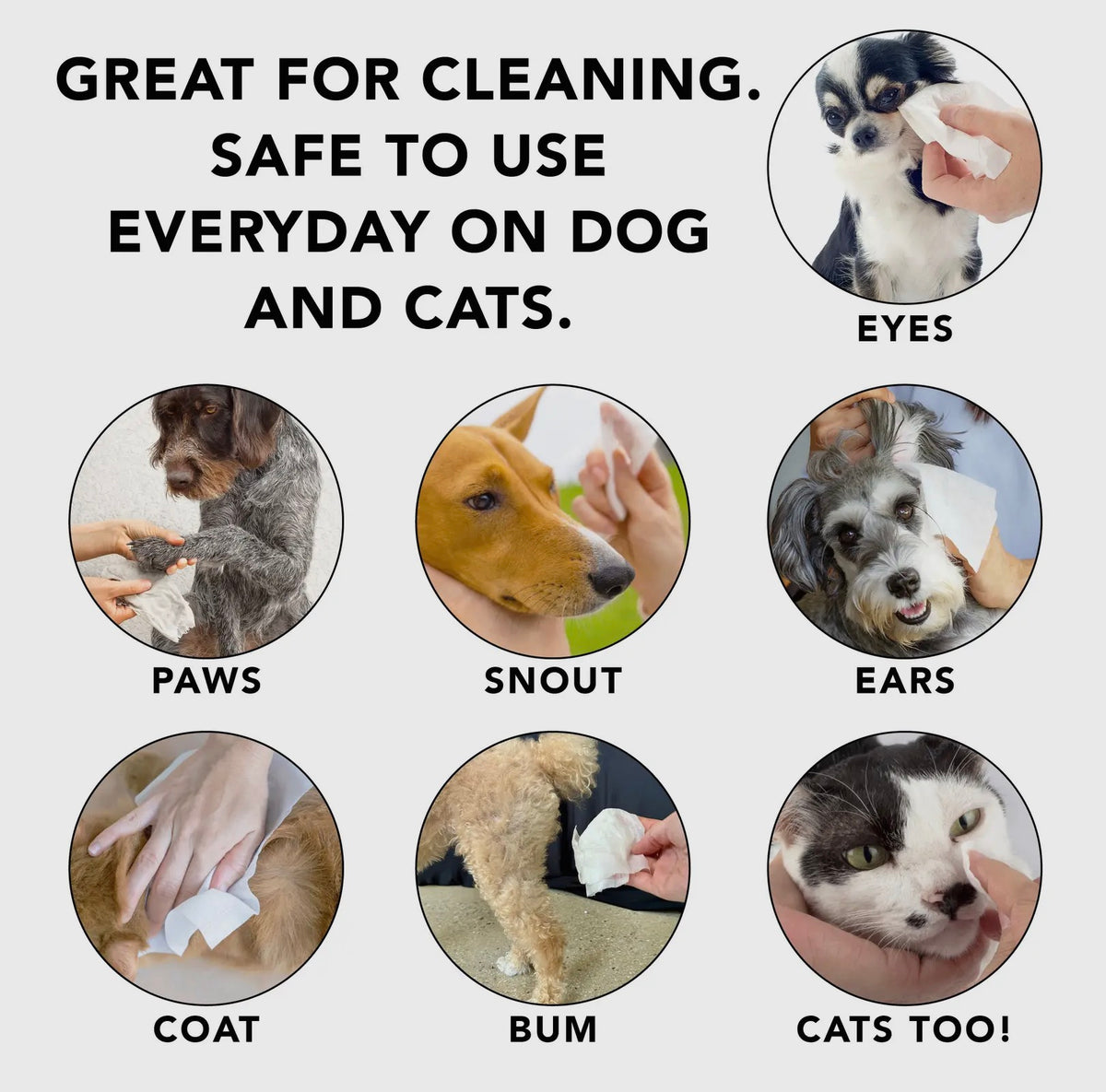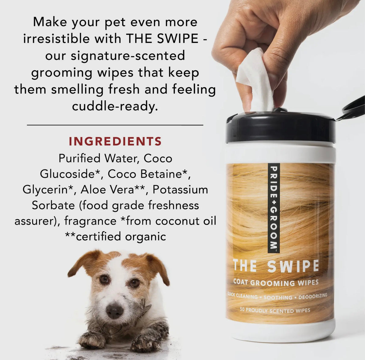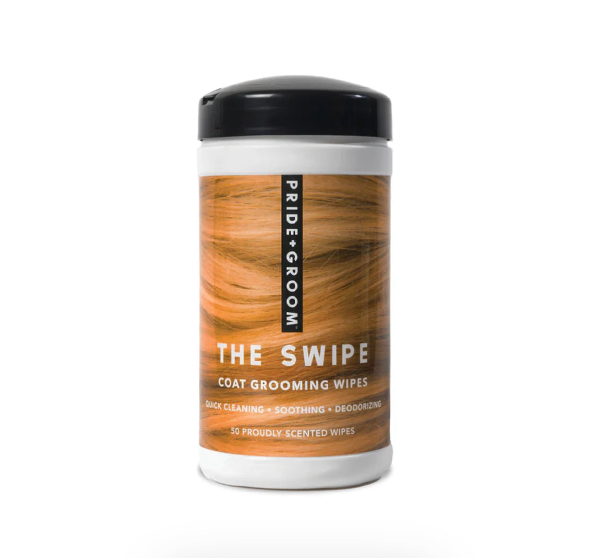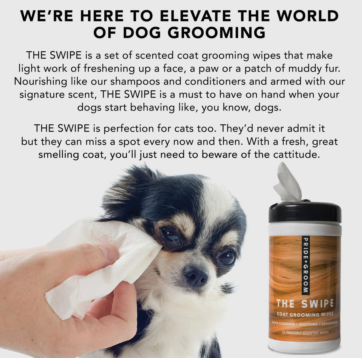 Pride+Groom The Swipe Wipes offer a convenient solution for maintaining your pet's hygiene. These wipes effectively clean faces, paws, and fur, delivering nourishment similar to pet shampoos. Enriched with botanicals, they provide a gentle, antiseptic clean without harsh chemicals, ensuring a fresh, healthy coat for both dogs and cats.