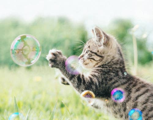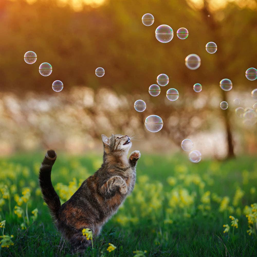 We firmly believe no pet should get sick playing with bubbles. We developed our exclusive formula to keep cats safe, happy, and loving bubbles. Here’s what you need to know. Our bubbles are made with all-natural plant-based materials. We have the highest standards to keep your pet safe. Unlike other pet bubbles on the market, our bubbles are paraben- and polyethylene glycol-free!