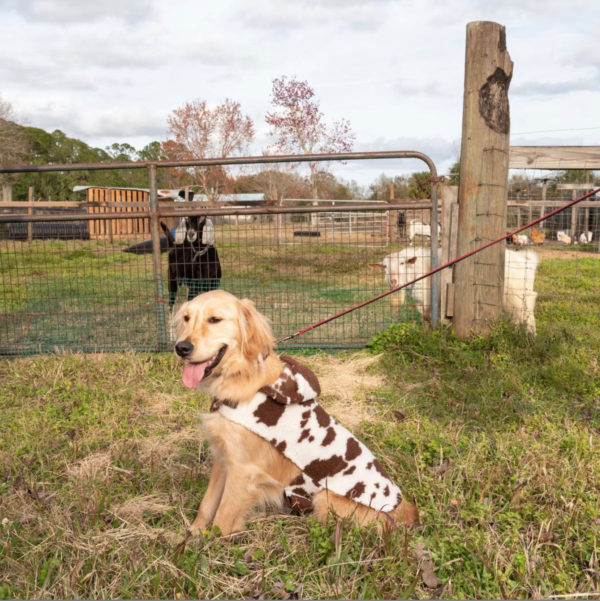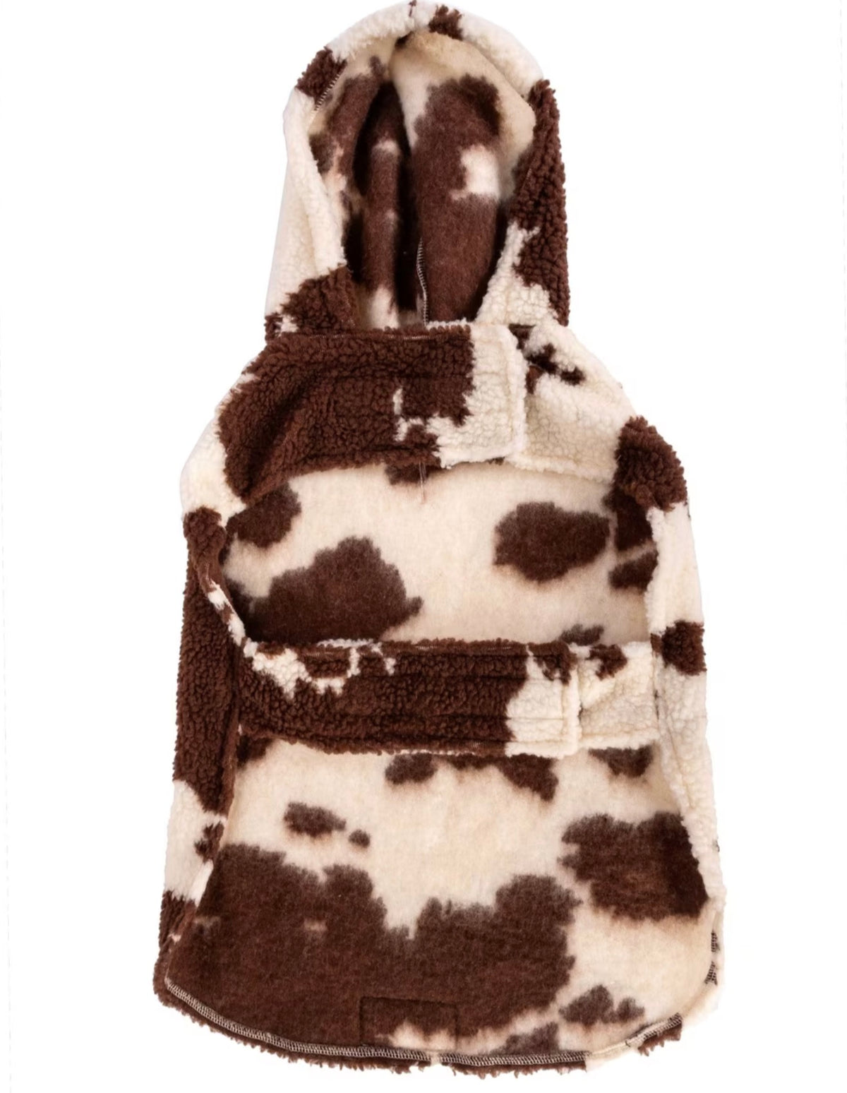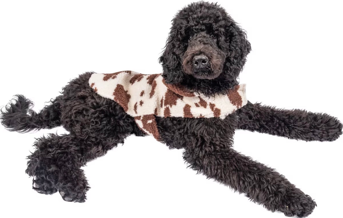 Get ready to "moo"-ve in style with our Wrangler Cow Print Fleece Hoodie! With velcro bands for easy on and off, convenient leash hole at back of neck, this hoodie is perfect for dogs of all sizes up to English Mastiffs and Great Danes. So go ahead, make your pup the trendiest cow on the block (without the mess)!